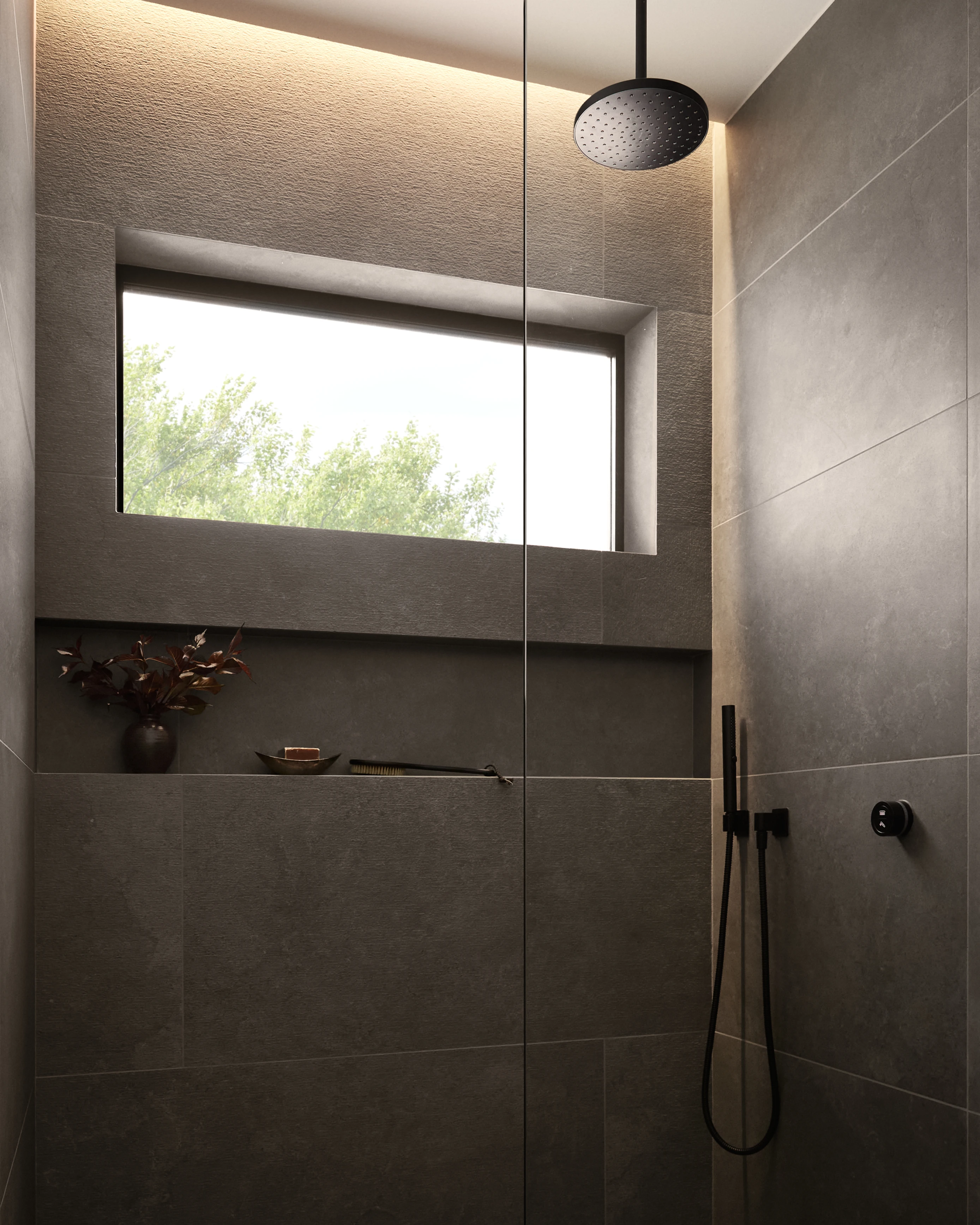 The architecture balances privacy and openness through controlled volumes, warm materiality, and expansive glazing that connects interior living spaces to the surrounding landscape.